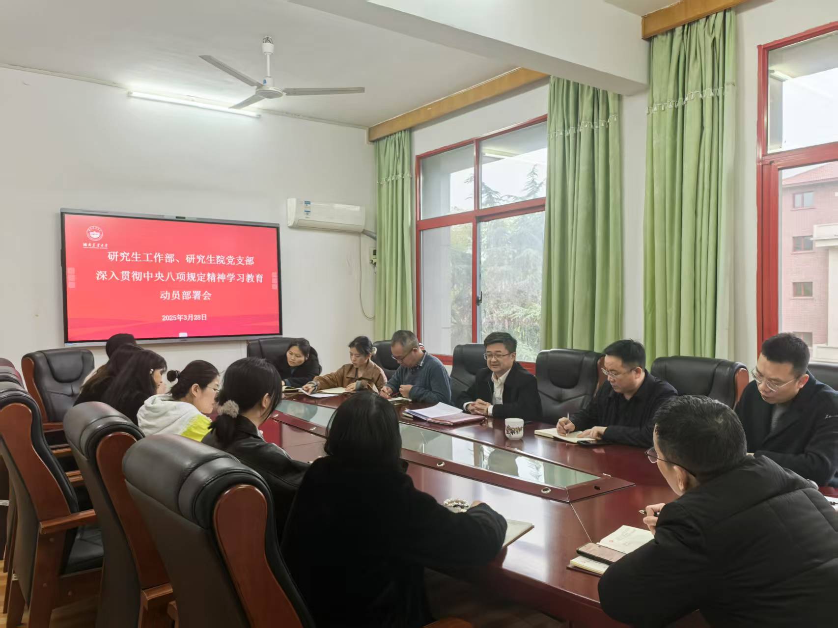 3月28日,研究生工作部、研究生院党支部组织召开深入贯彻中央八项规定精神学习教育动员部署会。党支部书记方俊主持会议,部门全体党员干部及职工参加会议。