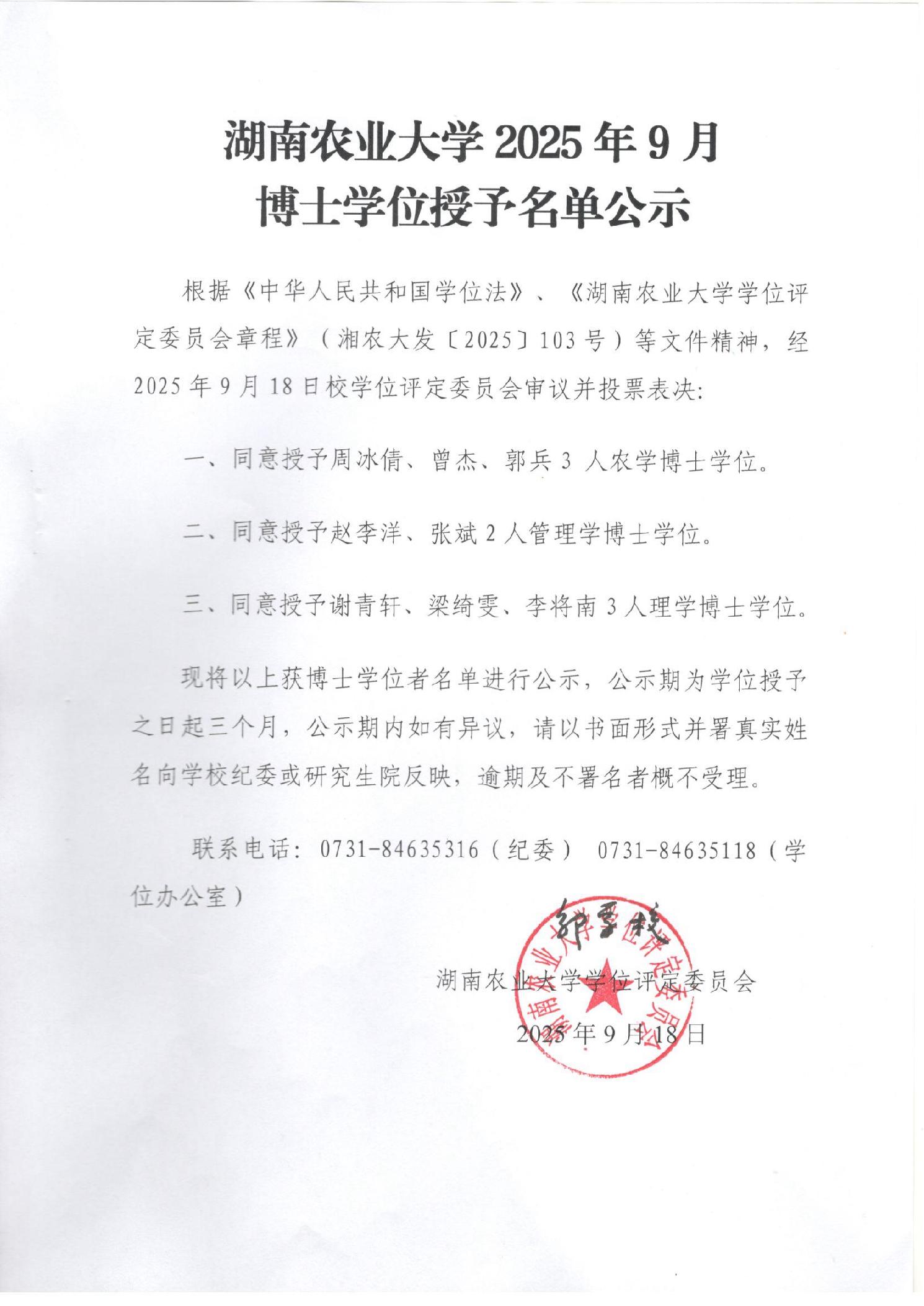 湖南农业大学2024年6月博士、硕士学位授予决议