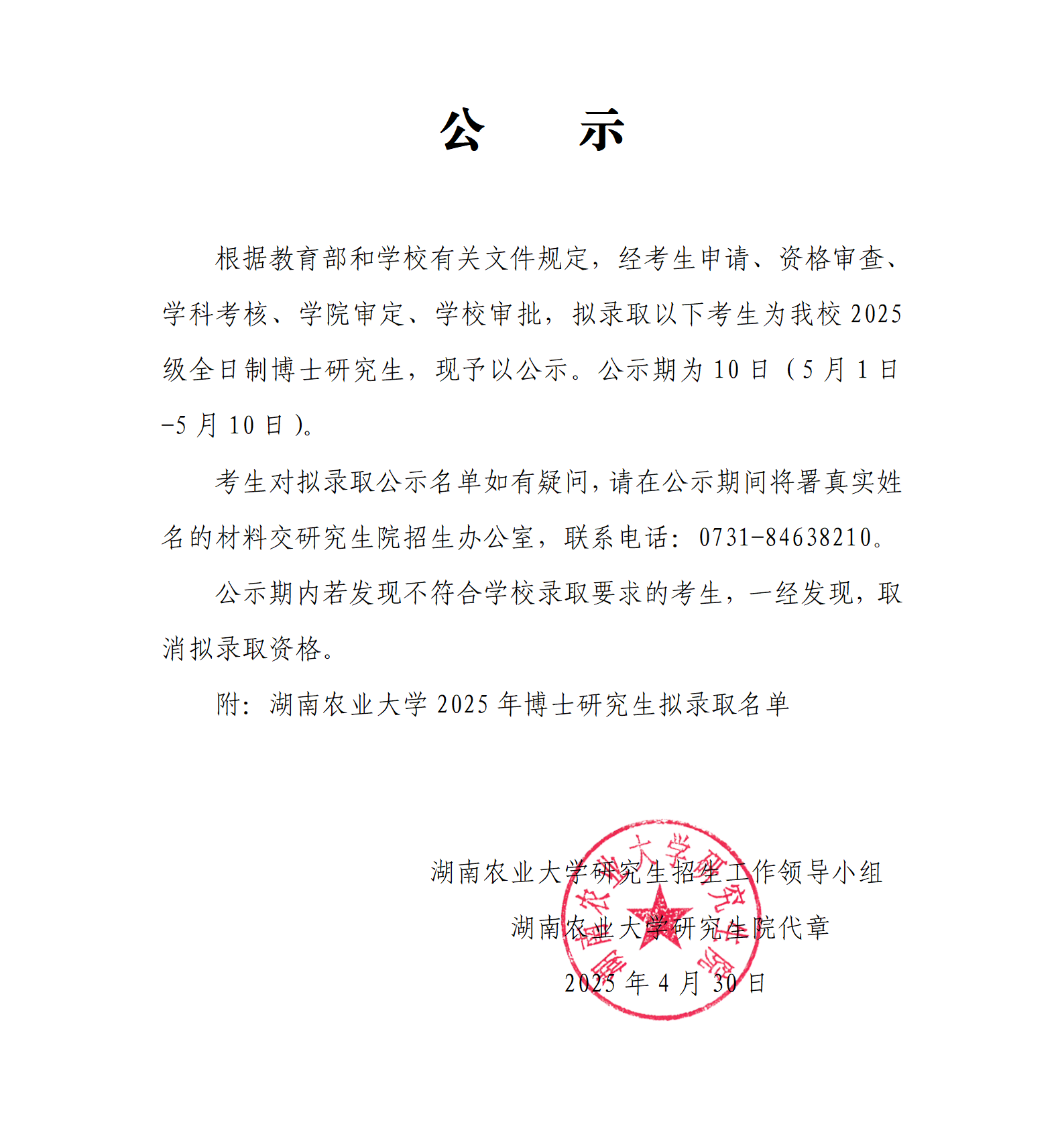 湖南农业大学2025年博士研究生放弃拟录取资格考生名单公示