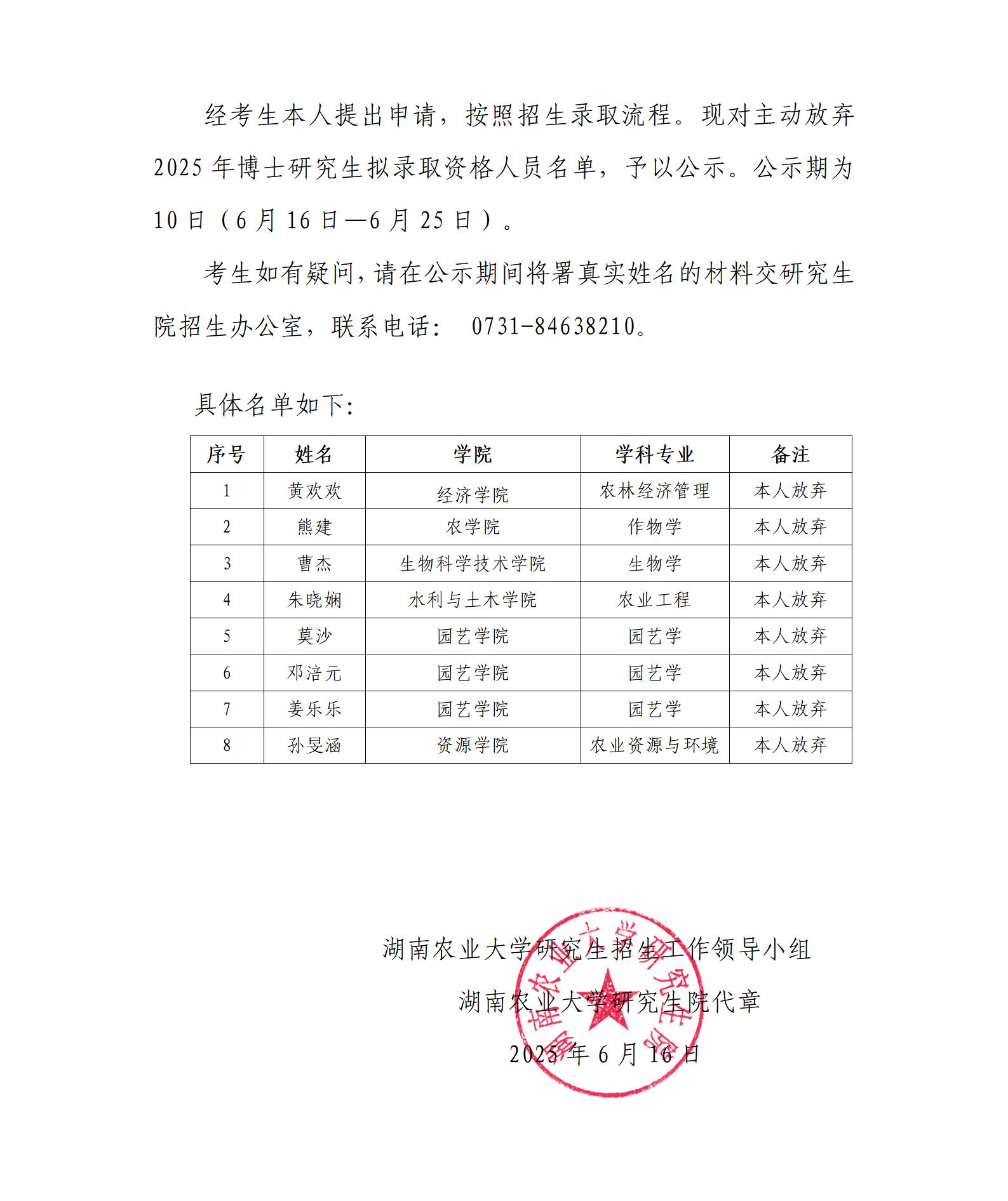 湖南农业大学2025年博士研究生放弃拟录取资格考生名单公示