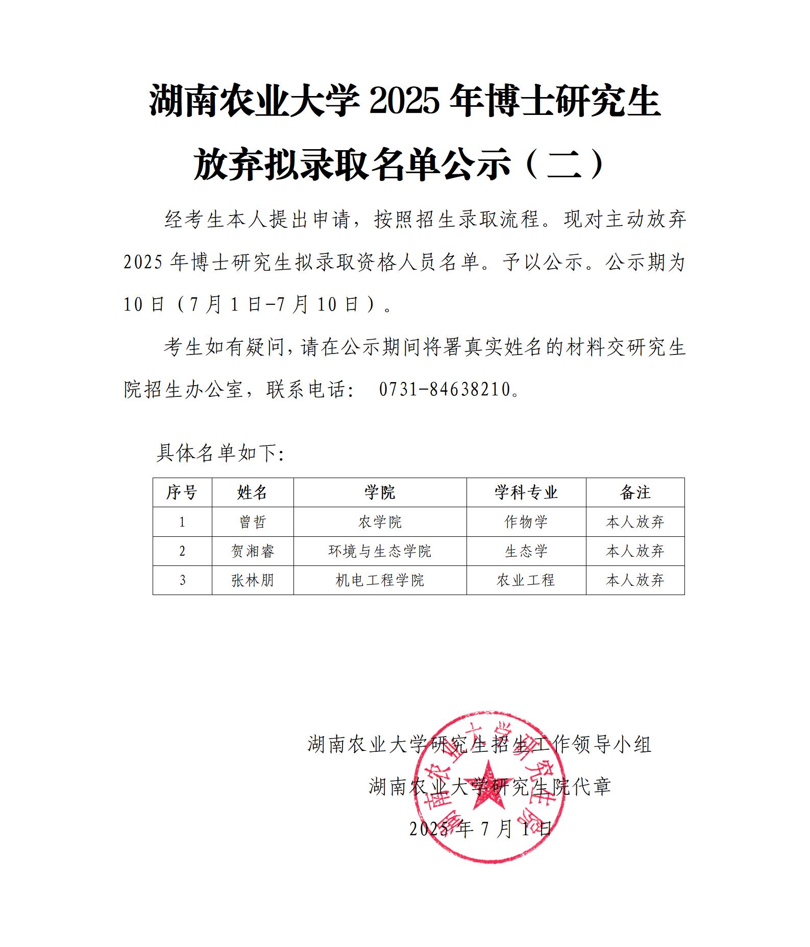 湖南农业大学2025年博士研究生放弃拟录取名单公示(二)
