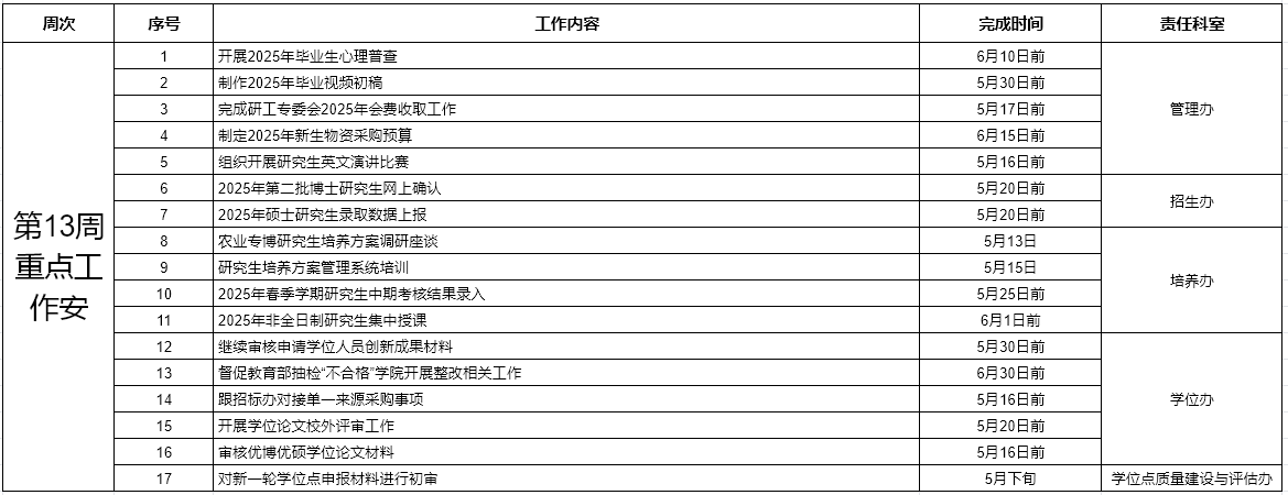 研究生工作部、研究生院2025年春季学期第十三周工作计划