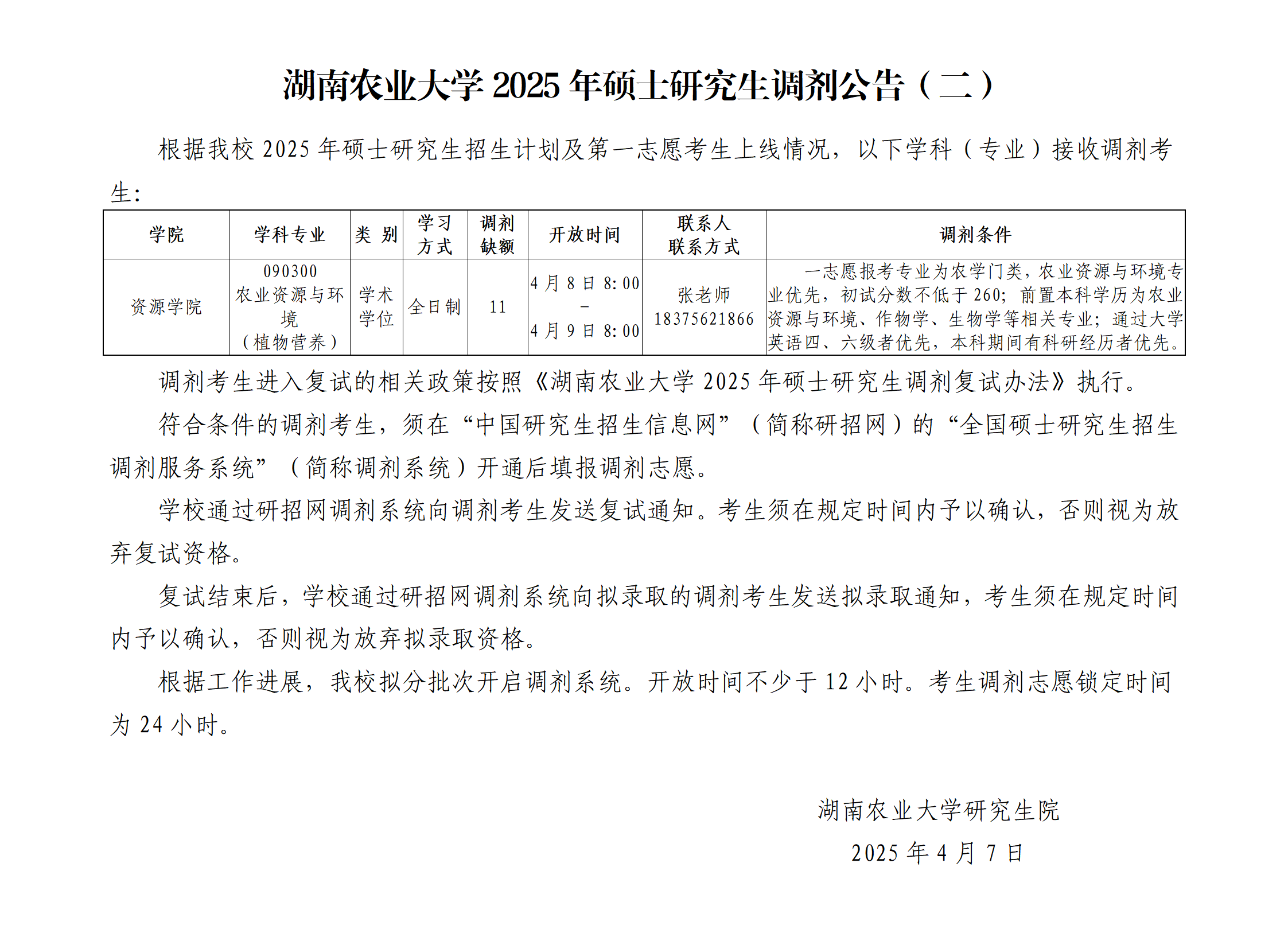 湖南农业大学2025年硕士研究生调剂公告(二)
