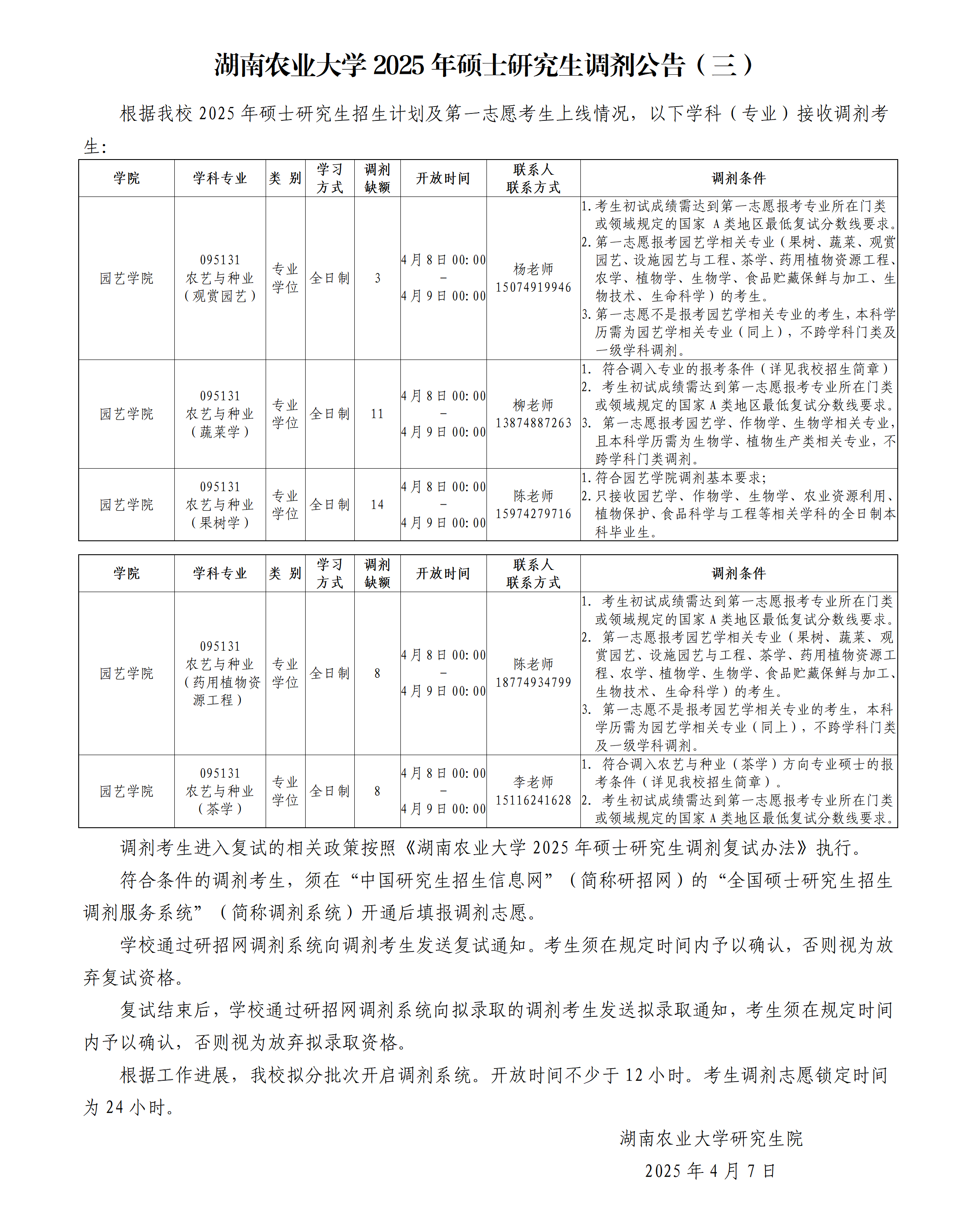 湖南农业大学2025年硕士研究生调剂公告(三)