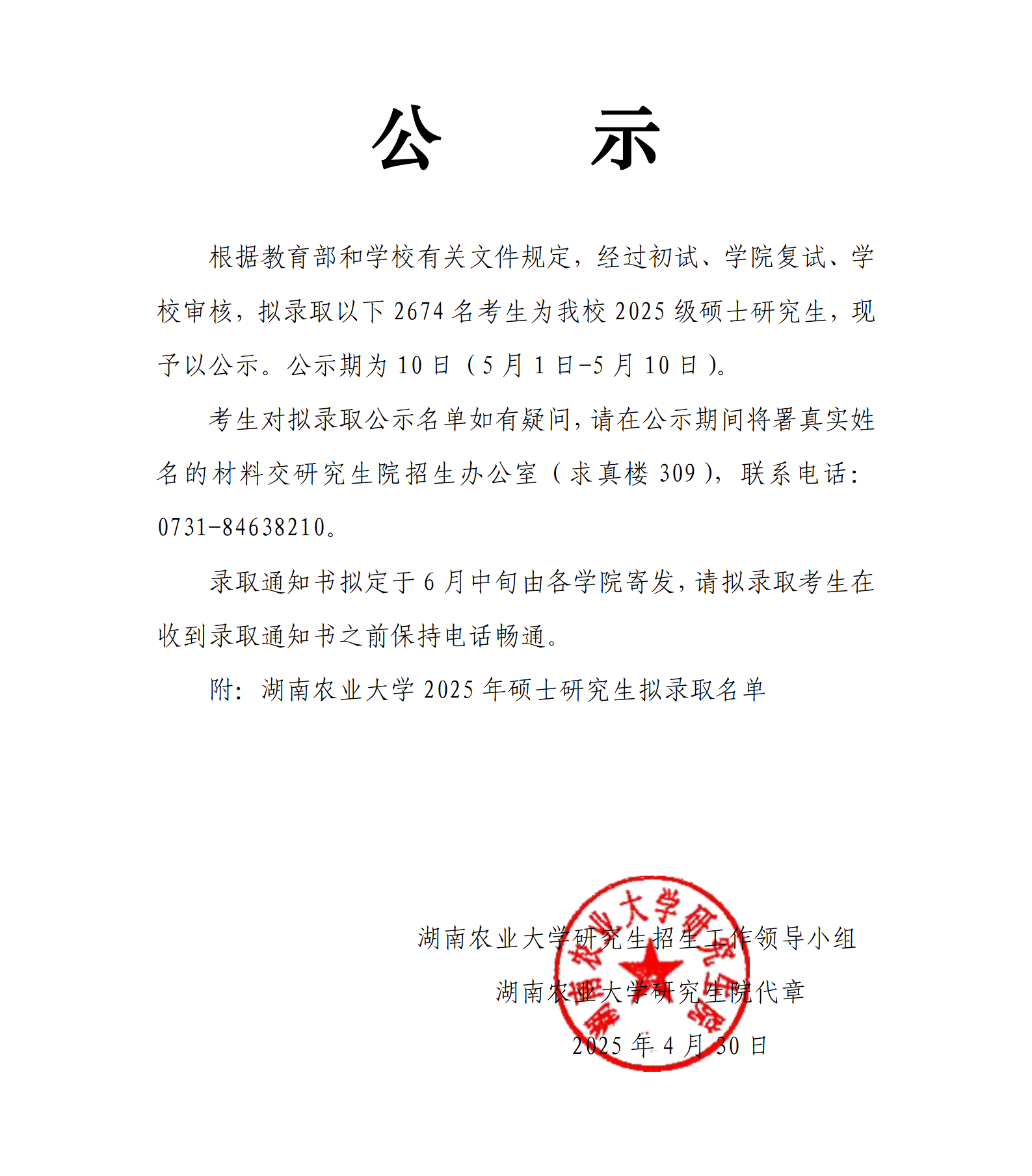 湖南农业大学2025年硕士研究生拟录取名单公示