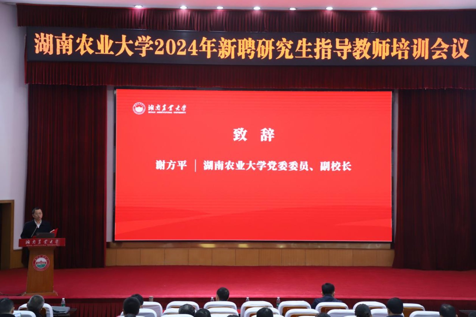 本网讯(研究生院 柳妙 肖嘉)2024年12月1日,我校在修业学堂举办2024年度新聘研究生指导教师培训会。校党委委员、副校长谢方平出席会议并致辞,湖南农业大学党委书记陈弘、《学位与研究生教育》杂志社社长兼执行主编周文辉研究员、湖南省科技厅科技监督与诚信建设处刘高处长、中南大学学位办主任湛利华教授、中南大学研招办主任郭克华教授、湖南农业大学公共管理与法学学院王薇院长、学生工作部朱佳副部长担任主讲嘉宾。培训会分上、下两个单元,分别由湖南农业大学研究生院院长方俊、副院长欧立军主持。各研究生培养单位新聘研究生导师参加培训会议。